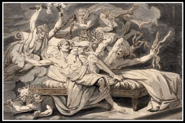 In Homer’s Iliad, the Furies can prevent an individual from using their reason and so lead them to unusual and stupid acts. They live in Erebos, or darkness, and have no pity in their hearts. They cursed a king with temporary madness.